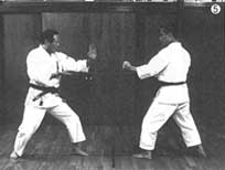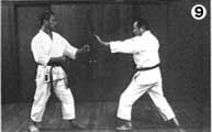 相手の突き・蹴りを前に構えた手で掌底を用い、押え受け・落し受けで受けると同時に、逆の貫手で相手の目、または喉を突き刺して、攻撃する。