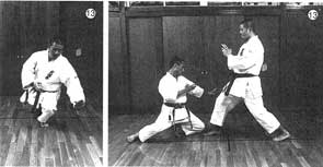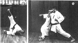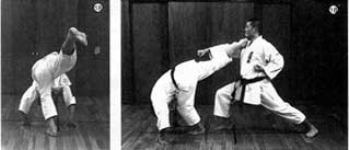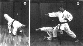 相手の攻撃に体し、カウンターで放つことが原則。回転すると同時に両腕をつき、全身のバネを用いて、一気に蹴りを相手に叩き込む。(写真16〜18)これもさきほどの斜状蹴りと同じく、三次元的な蹴りの一つだ。
